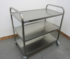 Celonerezový servírovací vozík je zhotoven z nerez trubky o průměru 25 mm, tři lisované police z plechu tl. 1 mm jakosti 17240. Je postaven na čtyřech kolečkách, ze kterých jsou dvě opatřeny aretační brzdou.